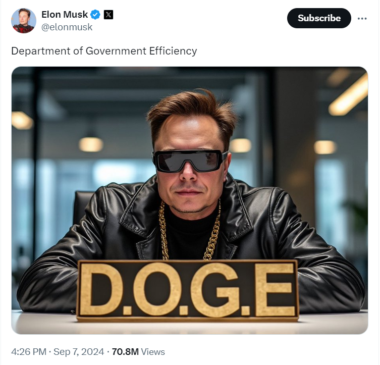 머스크는 트럼프가 제안한 정부 효율성 부서, 소위 'D.O.G.E 부서'의 수장을 맡기로 동의했으며, 이는 그가 도지코인(DOGE)과 관련된 농담에서 비롯된 것이다. 이 발언으로 인해 도지코인의 가격은 지난주 동안 25% 상승했다. 또한, 억만장자 마크 큐반은 "머스크가 도지코인을 미국 재무부에 넣을 수 있다"고 농담하기도 했다.